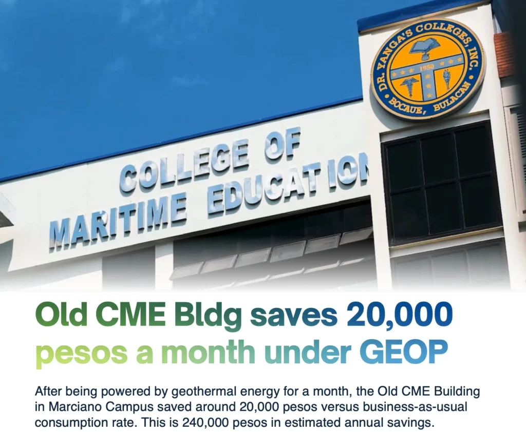 As of October 26, the old College of Maritime Education (CME) Building of DYCI’s Marciano Campus runs purely from geothermal energy thanks to the Green Energy Option Program (GEOP), with three more buildings set to make the big switch next year.