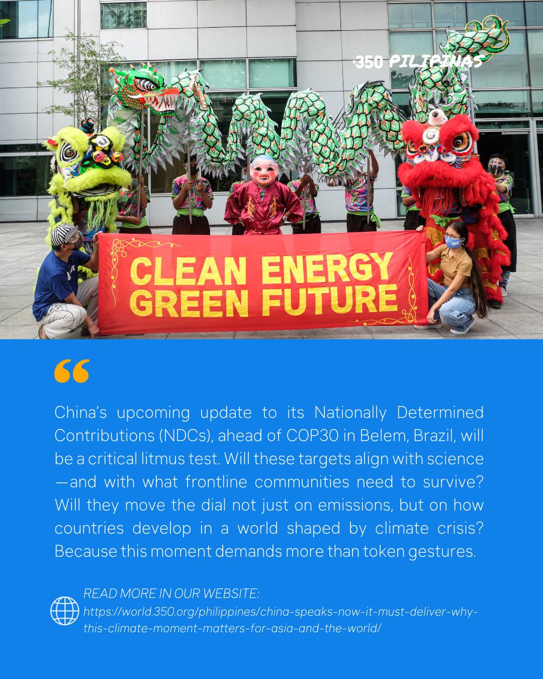 The action was part of 350 Pilipinas’ ongoing work to engage China as both a major emitter and a potential climate leader. They have supported campaigns like Go Clean ICBC, which challenges China’s biggest bank to divest from fossil fuels and fully embrace renewables. A report from the coalition revealed ICBC to be the world’s largest funder of fossil fuels—but also the largest backer of renewable energy, ahead of U.S. banks. We believe this dual role gives China a unique responsibility and opportunity to lead the global shift to clean energy—if its commitments are matched by bold, community-driven implementation.