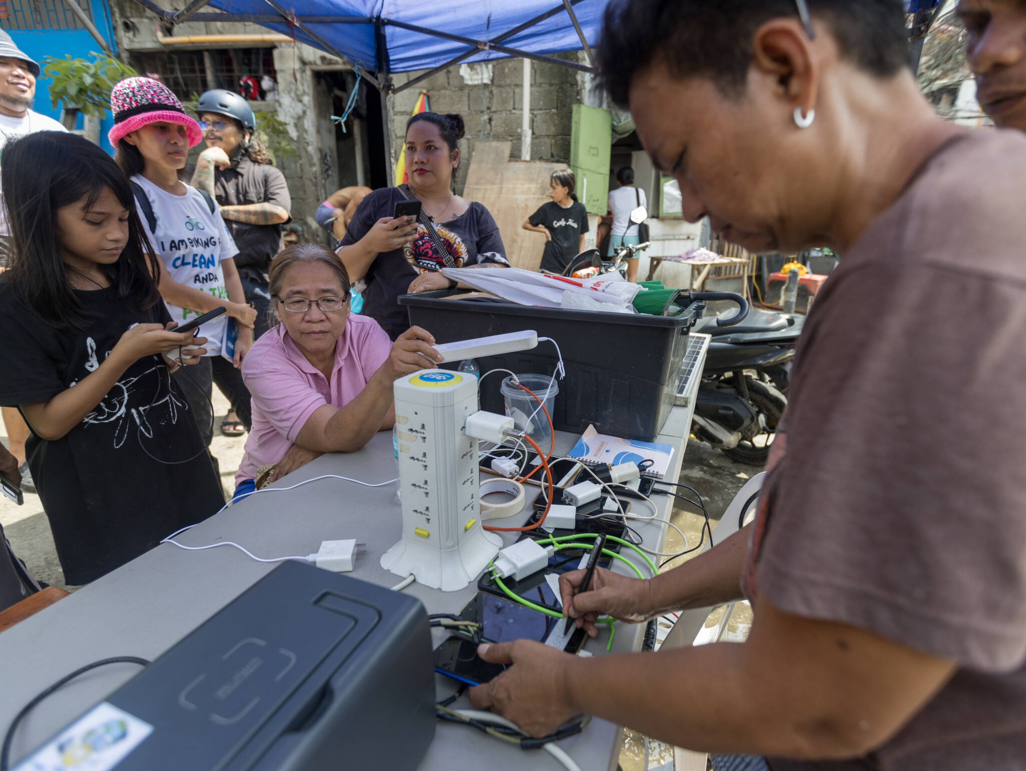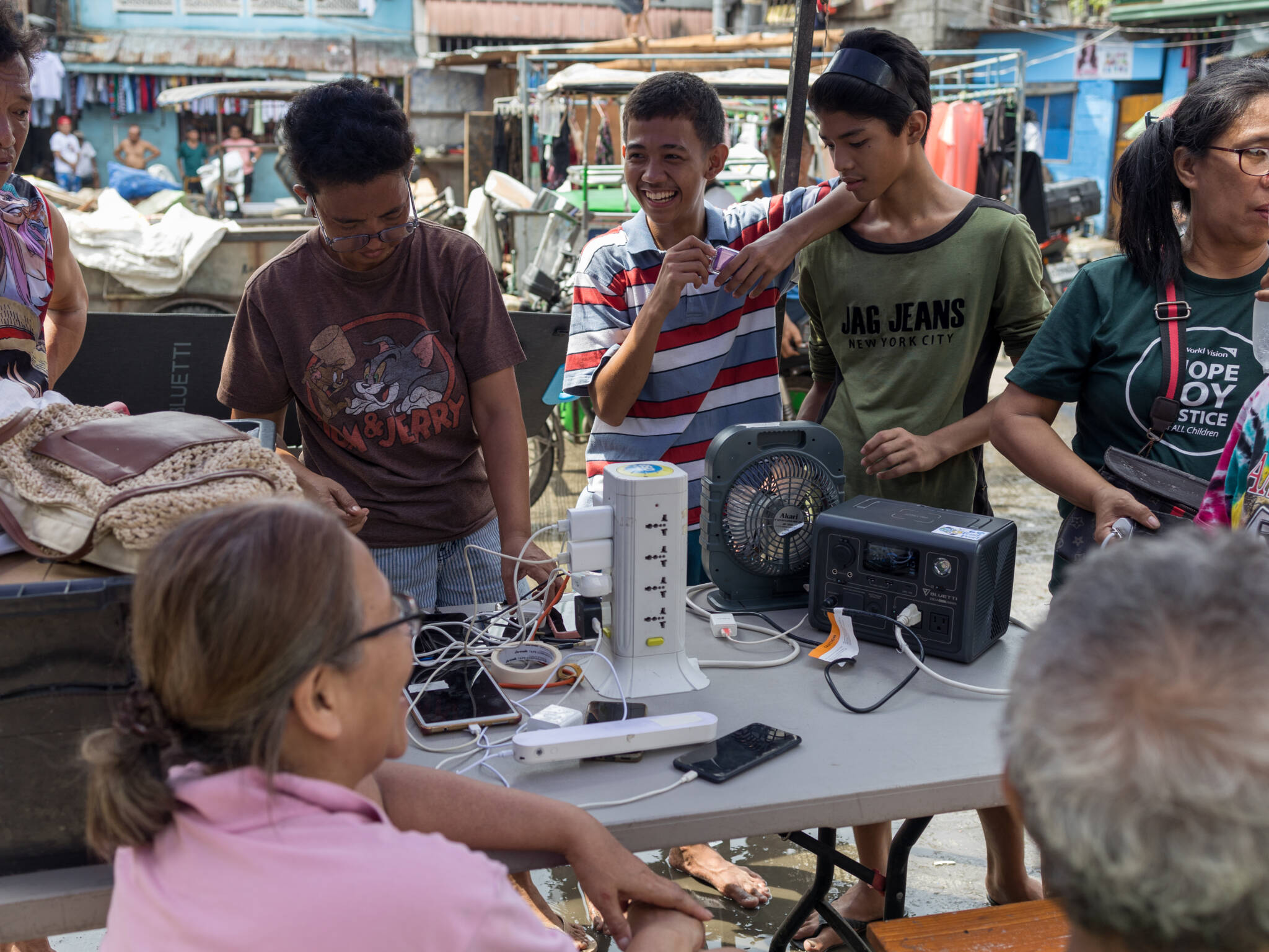Residents in Barangay Tatalon, Quezon City, Philippines charge their mobile devices using the solar charging station by Nanay Powers and 350 Pilipinas. Super Typhoon Carina (Gaemi) brought immense flooding that caused damage to houses and several days of power outages. Portable charging stations are important for disaster response in places at risk of flooding during typhoons. Photos by Kathleen Lei Limayo for 350.org