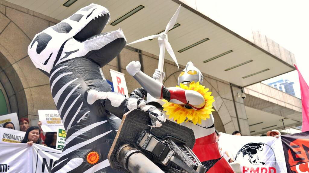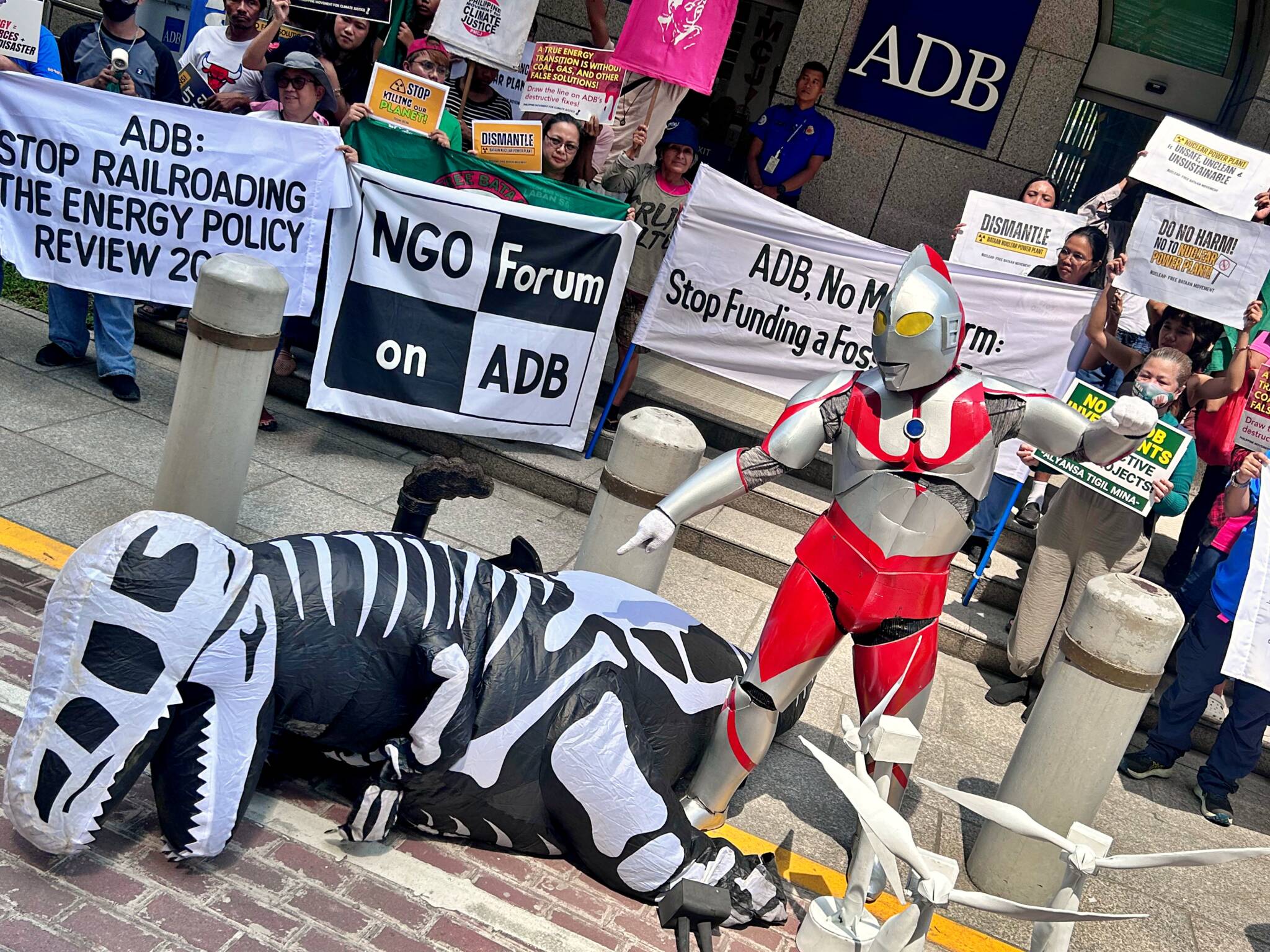 Groups demand an energy future worth living in, urging the Asian Development Bank to halt its rushed 2025 Energy Policy Review, reject false solutions, and commit to a full fossil fuel phaseout. At today’s creative action, climate and justice groups, led by NGO Forum on ADB and 350 Pilipinas, were joined by Alyansa Tigil Mina , 350.org Asia , Philippine Movement for Climate Justice (PMCJ), Asian Peoples’ Movement on Debt and Development, Coalition for Human Rights in Development , Zero Waste Asia , and Recourse. Originally slated for completion in early 2026, the review has been fast-tracked to September 2025 with minimal public consultation, undermining the ADB’s own transparency commitments. The creative action featured Ultraman, protecting the communities against fossil fuels. Photo: Nadia Cruz