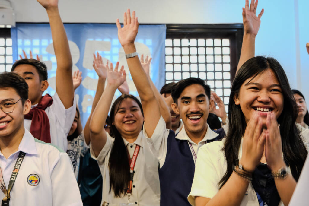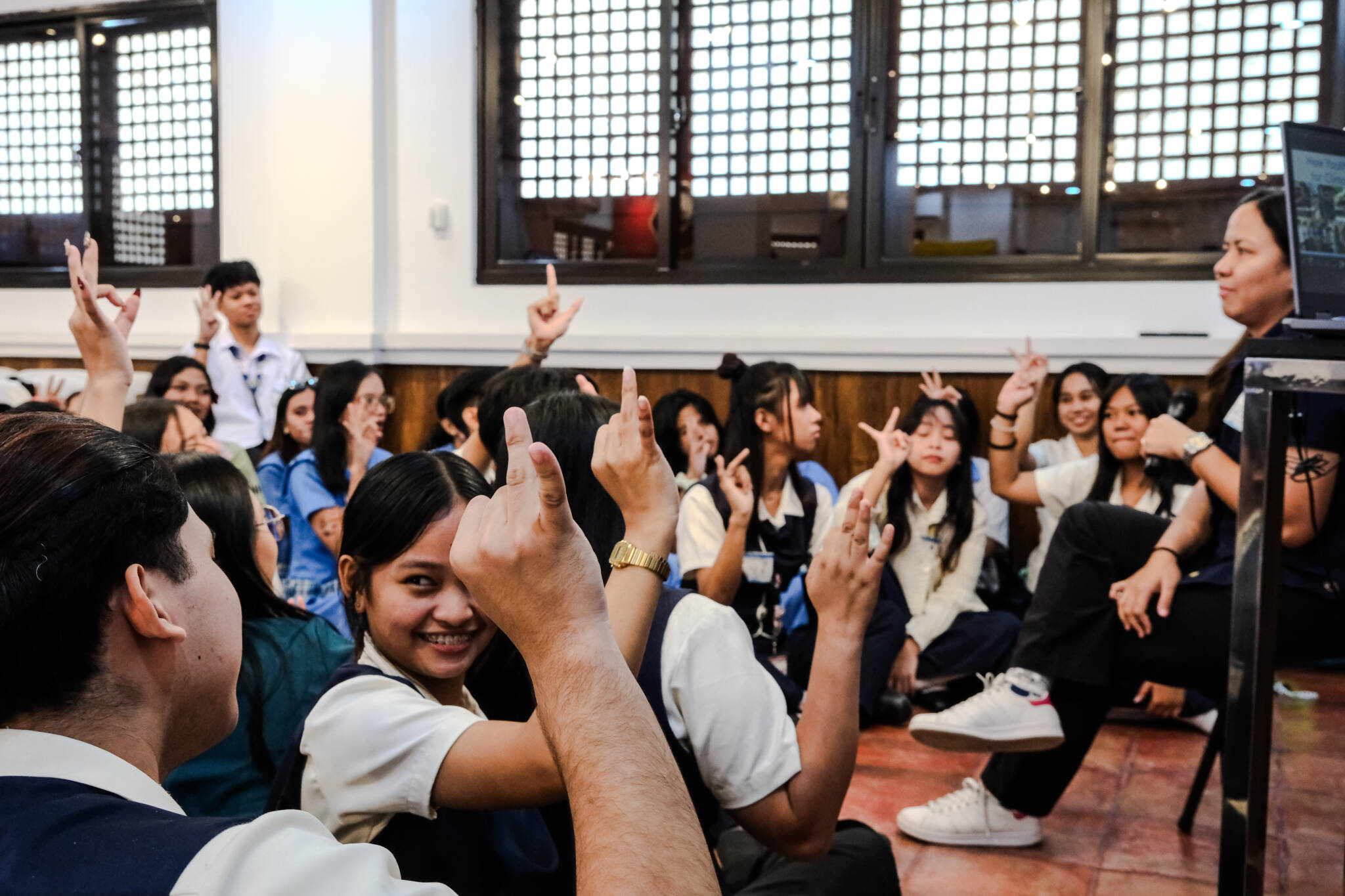 Students play ‘Put a Finger Down’ with 350 Pilipinas Youth Engagement Campaigner, Jean Coper. Questions explores students’ experiences as young-leaders and advocacies on climate and environment. Photo: Nadia Cruz